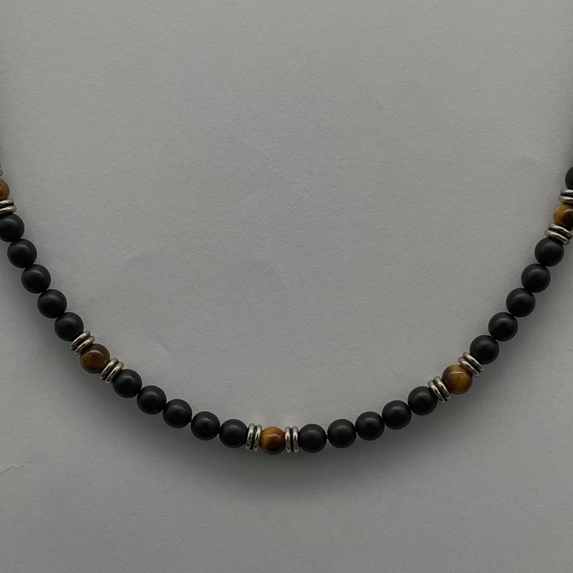 Diese besondere Kette spricht vor allem für ihr schlichtes aber dennoch herausstechendes Aussehen, welche durch ihre sogenannten Tiger-Perlen mit 100% Naturstein einzigartig wirkt. Sie passt zu jedem Outfit, ob ein schicker Anzug/Kleid oder einfach für die täglichen Situationen.